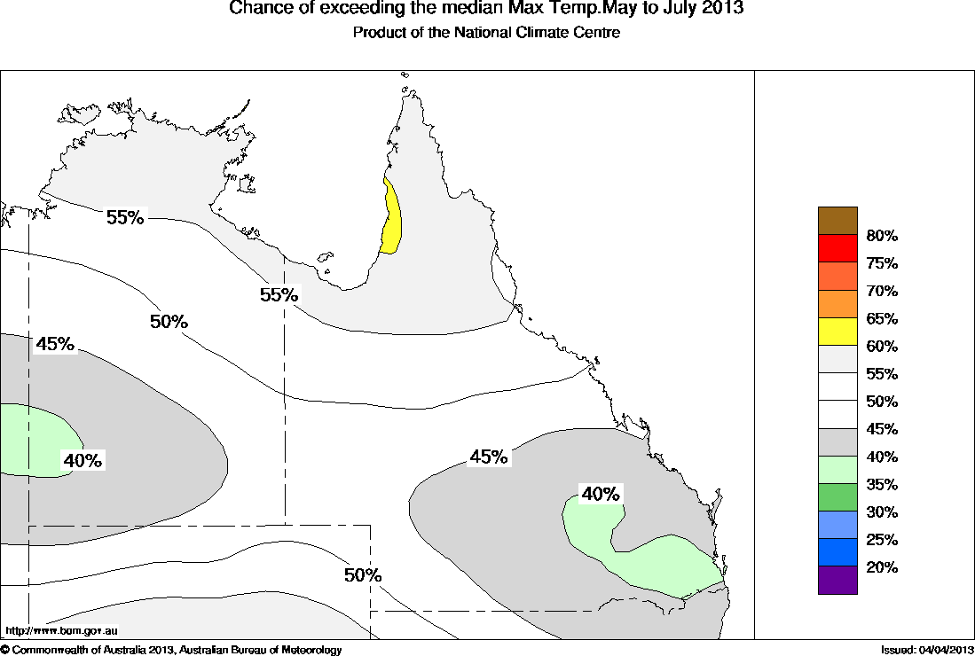 The chances that the May to July maximum temperature will exceed the long-term median maximum temperature are between 60 and 65% over a small part of the Cape York Peninsula (see map above). Such odds mean that for every ten years with similar ocean conditions about six May to July periods would be warmer than normal while about four year may be cooler.