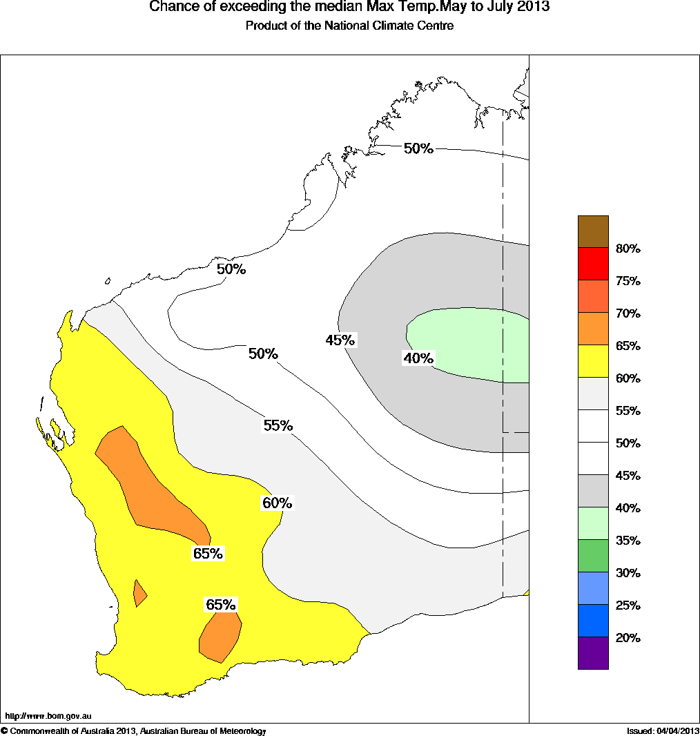 More information on this outlook is available from 8.30am to 4.30pm (WST) Monday to Friday by contacting the Climate Services Centre in the Bureau's Perth Office: (08) 9263 2222.