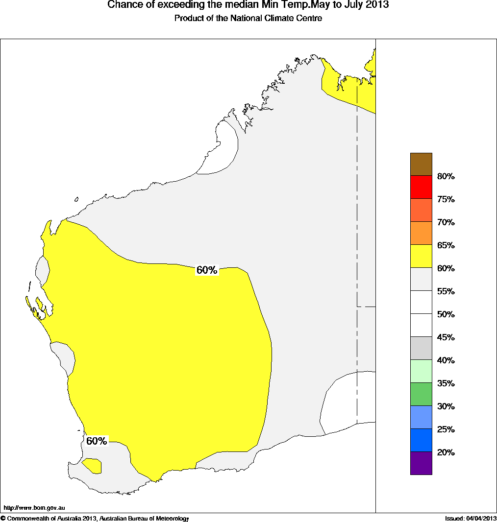 The chance that the average minimum temperature for May to July will exceed the long-term median minimum temperature is between 60 and 65% over most of western and central WA. For the remainder of WA, the chances of warmer or cooler minimum temperatures are roughly equal (see map above).