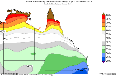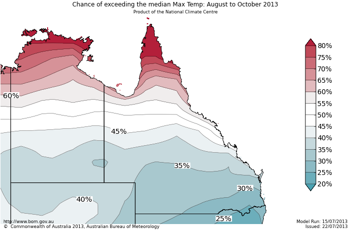 The chances of the August to October maximum temperature exceeding the long-term median maximum temperature are greater than 60% over the tropical north. Such odds mean that for every ten years with similar climate patterns to those currently observed, about six to eight August to October periods would be expected to be warmer than average over these areas, while about two to four years would be cooler.
