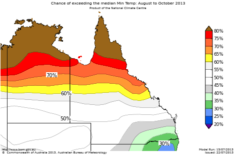 The chance that the average minimum temperature for August to October will exceed the long-term median minimum temperature is in excess of 60% over the tropical north; probabilities exceed 80% over much of the Top End of the NT and Cape York Peninsula.