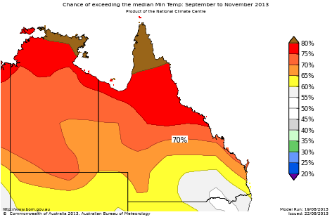 The chances of the spring maximum temperature exceeding the long-term median maximum temperature are greater than 60% over the tropical north (see map above). Such odds mean that for every ten years with similar climate patterns to those currently observed, about six to eight spring periods would be expected to be warmer than average over these areas, while about two to four years would be cooler.