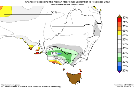 Conversely, there is a 30 to 40% chance of warmer than normal days over southern New South Wales, northern and central Victoria and an area of southeast South Australia. In other words, there is a 60 to 70% chance of cooler than normal days in these areas.