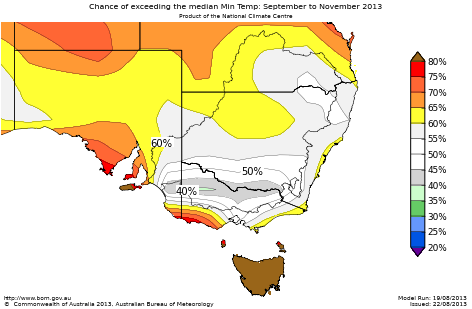The chance that the average minimum temperature for spring will exceed the long-term median minimum temperature is in excess of 60% across most of South Australia, parts of northern New South Wales and the east coast, and an area of southern Victoria. Probabilities exceed 80% right across Tasmania.