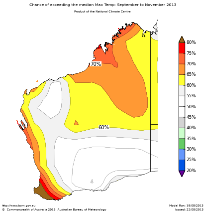 The chances of the spring maximum temperatures exceeding the long-term median maximum temperature are greater than 60 % in large parts of northern and western WA, and over 80% in the southwest corner (see map above). Such odds mean that for every ten years with similar climate patterns to those currently observed, about six to eight spring periods would be expected to be warmer than average over these areas, while about two to four years would be cooler.