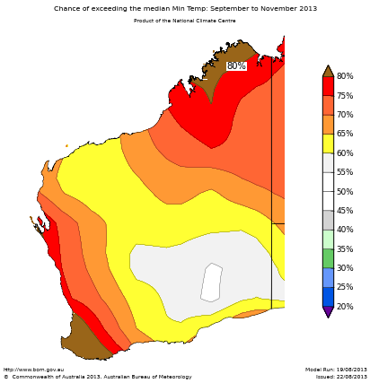 The chances that the average minimum temperature for spring will exceed the long-term median minimum temperature are greater than 60 % for most of WA. Probabilities exceed 80% in the far north Kimberley and southwest corner. In southeast WA, the chances of warmer or cooler night-time temperatures are roughly equal.