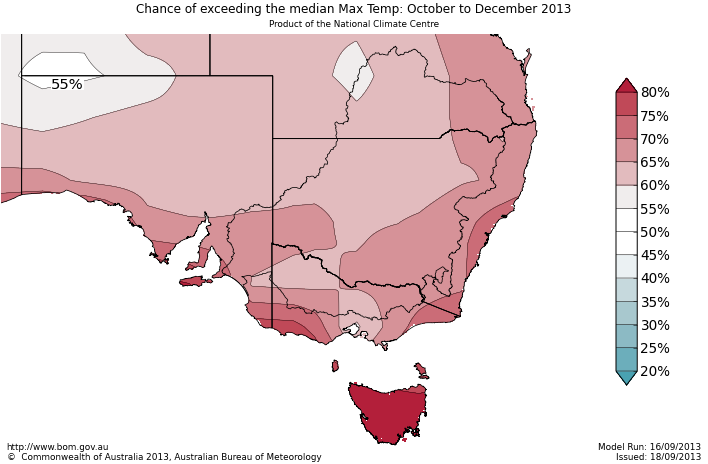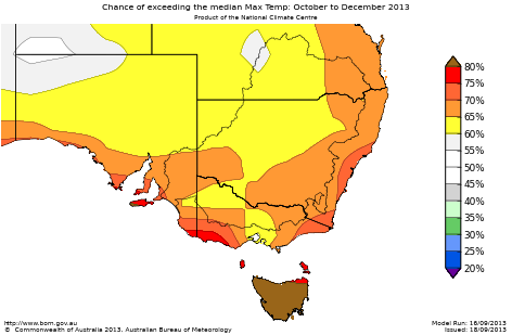 The chances that the October to December maximum temperature will exceed the long-term median maximum temperature are greater than 60% across most of southeast Australia, with odds greater than 70% in Tasmania and parts of the south and east coasts. Such odds mean that for every ten years with similar climate patterns to those currently observed, about six to eight years would be expected to be warmer than average over these areas, while about two to four years would be cooler.