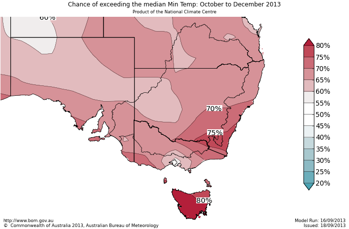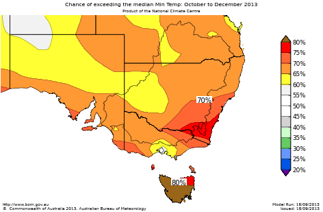 The chance that the average minimum temperature for October to December will exceed the long-term median minimum temperature is greater than 60% over most of southeast Australia, with odds greater than 70% in Tasmania and southeast NSW.