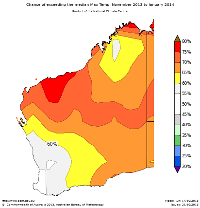 The chances of the November to January maximum temperature exceeding the long-term median maximum temperature are greater than 60% over much of WA, except for the southwest. Odds increase to greater than 70% in the far north. So for every ten November to January outlooks with similar odds to these, about six or seven of them would be expected to be warmer than average over these areas, while about three or four years would be cooler.