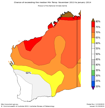 The chances that the average minimum temperature for the November to January period will exceed the long-term median are greater than 60% over much of WA, except for the southwest. Probabilities rise to greater than 80% in the far north.