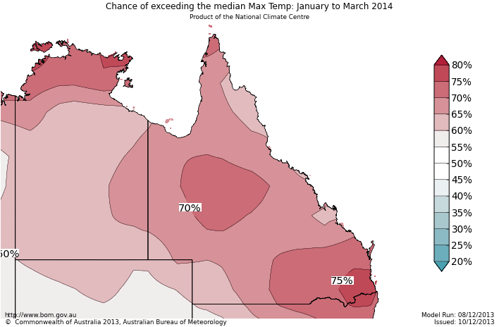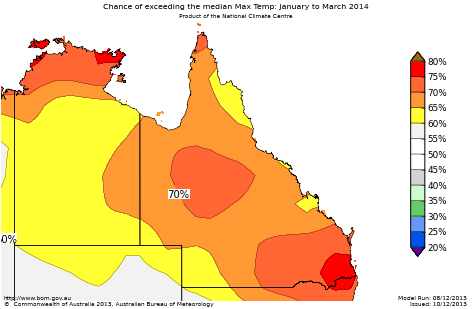 The chances of the January to March maximum temperature exceeding the long-term median maximum temperature are greater than 60% over northern Australia (see map). Odds increase to greater than 70% over the Top End of the NT and central and southern Queensland. So for every ten January to March outlooks with similar odds to these, about six or seven of them would be expected to be warmer than average over these areas, while about three or four years would be cooler.
