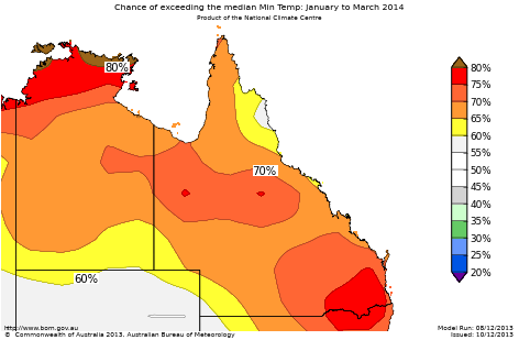 The chances that the average minimum temperature for January to March will exceed the long-term median are greater than 60% over northern Australia (see map). Odds increase to greater than 70% over the Top End of the NT and parts of central and southern Queensland.