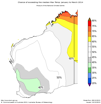 Conversely, the chances of exceeding the median maximum temperature is less than 40% over southwest WA, whilst the chances of receiving a cooler or warmer than normal January to March is roughly equal (i.e., close to 50%) over the remainder of the State.
