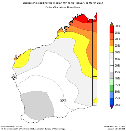 Across most of WA, the chances of receiving a cooler or warmer than normal January to March in terms of minimum temperatures is roughly equal (i.e., close to 50%).