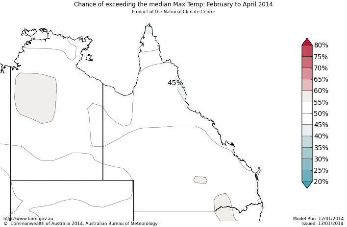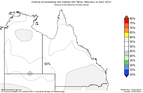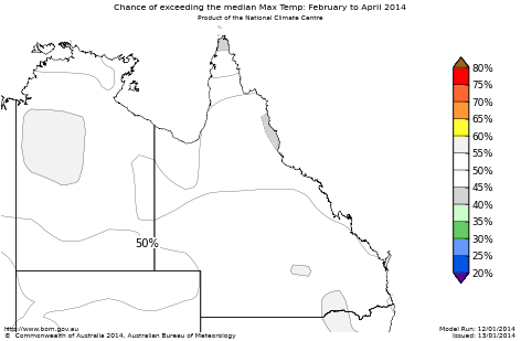 The chances of the February to April temperature (either maximum or minimum) exceeding the long-term median are near 50% over northern Australia (see map). So for every ten February to April outlooks with similar odds to these, about five of them would be expected to be warmer than average over these areas, while about five would be cooler.