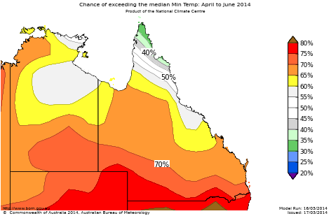The chances of receiving cooler or warmer than normal night-time temperatures for April to June is roughly equal (i.e., close to 50%) over the northeast of the NT, and Cape York Peninsula in Queensland. Elsewhere the outlook shows chances of greater than 60% for warmer than normal nights, with odds increasing to the south; odds exceed 75% along the southern Queensland border.