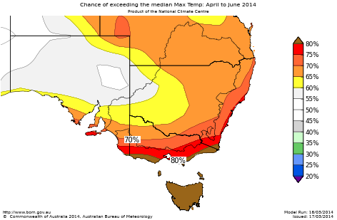 The April to June maximum temperature outlook shows chances of greater than 60% for warmer than normal days for southern SA, most of NSW and all of Victoria and Tasmania. Chances exceed 80% over southern Victoria and Tasmania. So for every ten April to June outlooks with similar odds to these, about six to eight of them would be warmer than average over these areas, while about two to four would be cooler.