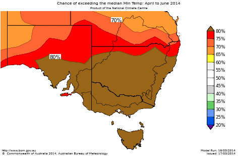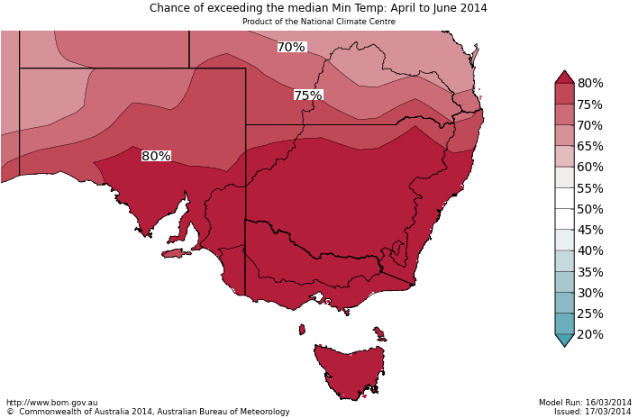 The chances that the average minimum temperature for April to June will exceed the long- term median are greater than 60% over all of southeast Australia. Chances exceed 80% over all of Tasmania, Victoria, most of NSW and southeast SA.