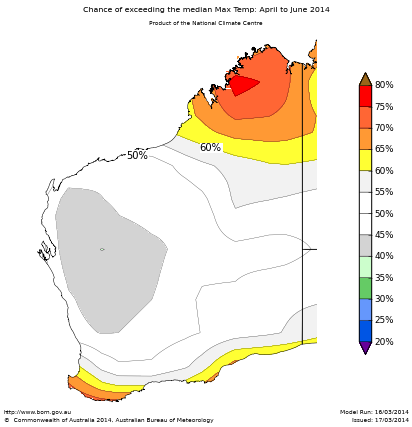 The April to June maximum temperature outlook shows chances of warmer than normal days are 60 to 70% across the Kimberley and near the south coast with chances greater than 75% in the north and west Kimberley. So for every ten April to June outlooks with similar odds to these, about six to eight of them would be warmer than average over these areas, while about two to four would be cooler.