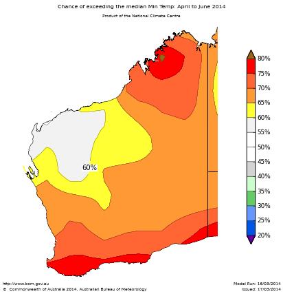 The chances that the average minimum temperature for April to June will exceed the long- term median are greater than 60% over most of WA, with chances exceeding 70% in the Kimberley and near the south coast.