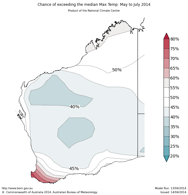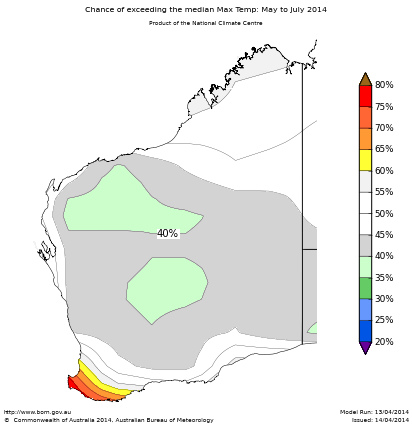 The May to July maximum temperature outlook shows a greater than 60% chance of experiencing warmer than normal daytime temperatures over the southwest coast of WA. So for every ten May to July outlooks with similar odds to these, about six to eight of them would be warmer than average over these areas, while about two to four would be cooler.