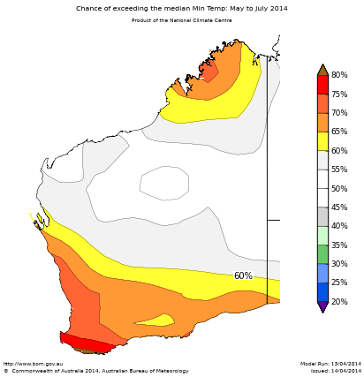 The chances that the average minimum temperature for May to July will exceed the long-term median are greater than 60% over much of the southern and far north WA (see map).