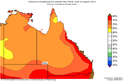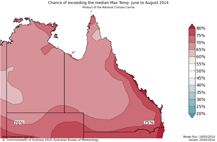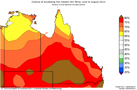 The chances that the average minimum temperature for June to August 2014 will exceed the long-term median are mostly greater than 60% over northern Australia. Chances rise to greater than 80% over southwest Queensland (see map).