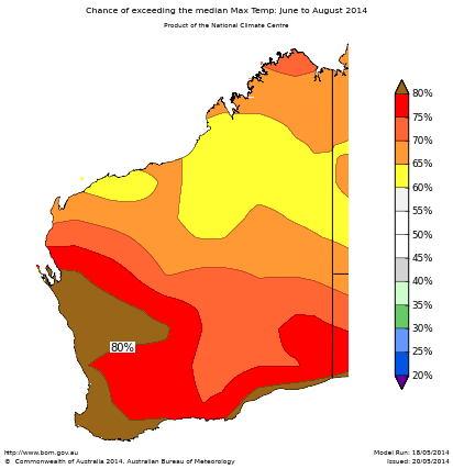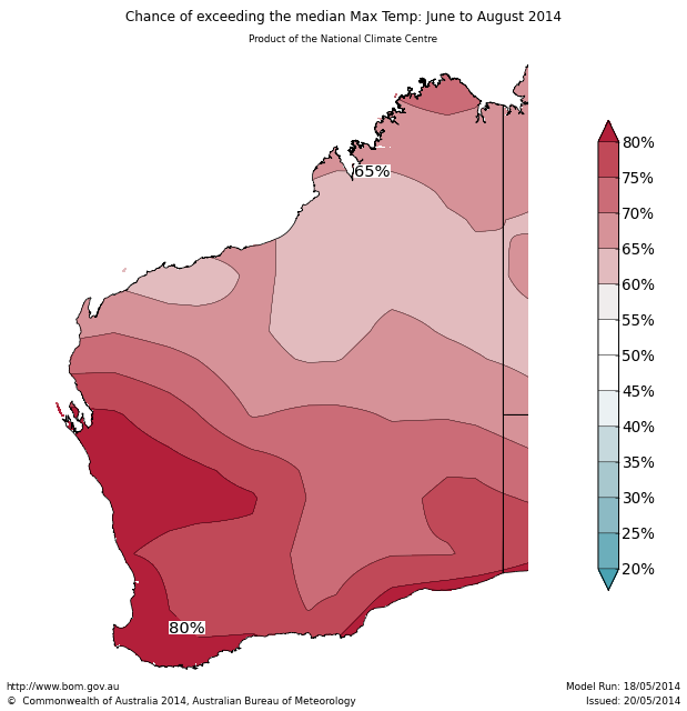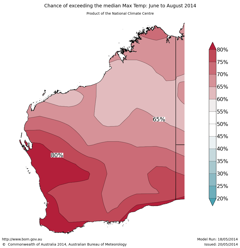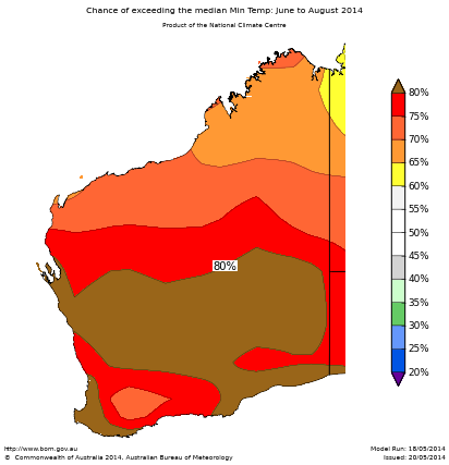 The chances that the average minimum temperature for winter 2014 will exceed the long-term median are greater than 60% across WA, rising to greater than 80% over much of the southern half (see map).