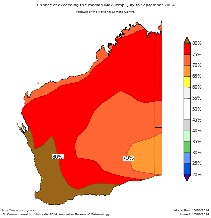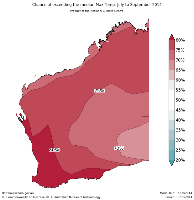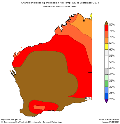 The chances that the average minimum temperature for July to September 2014 will exceed the long-term median are greater than 60% across WA, rising to above 80% over southern and central WA (see map).