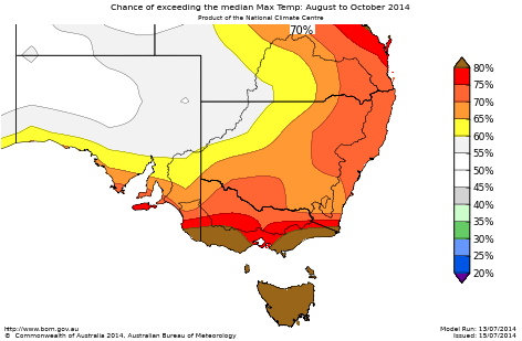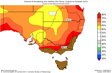 The chances that the average minimum temperature for August to October 2014 will exceed the long-term median are greater than 60% over southeast Australia. Chances rise to greater than 80% over southern Victoria, Tasmania, and southeast NSW (see map).