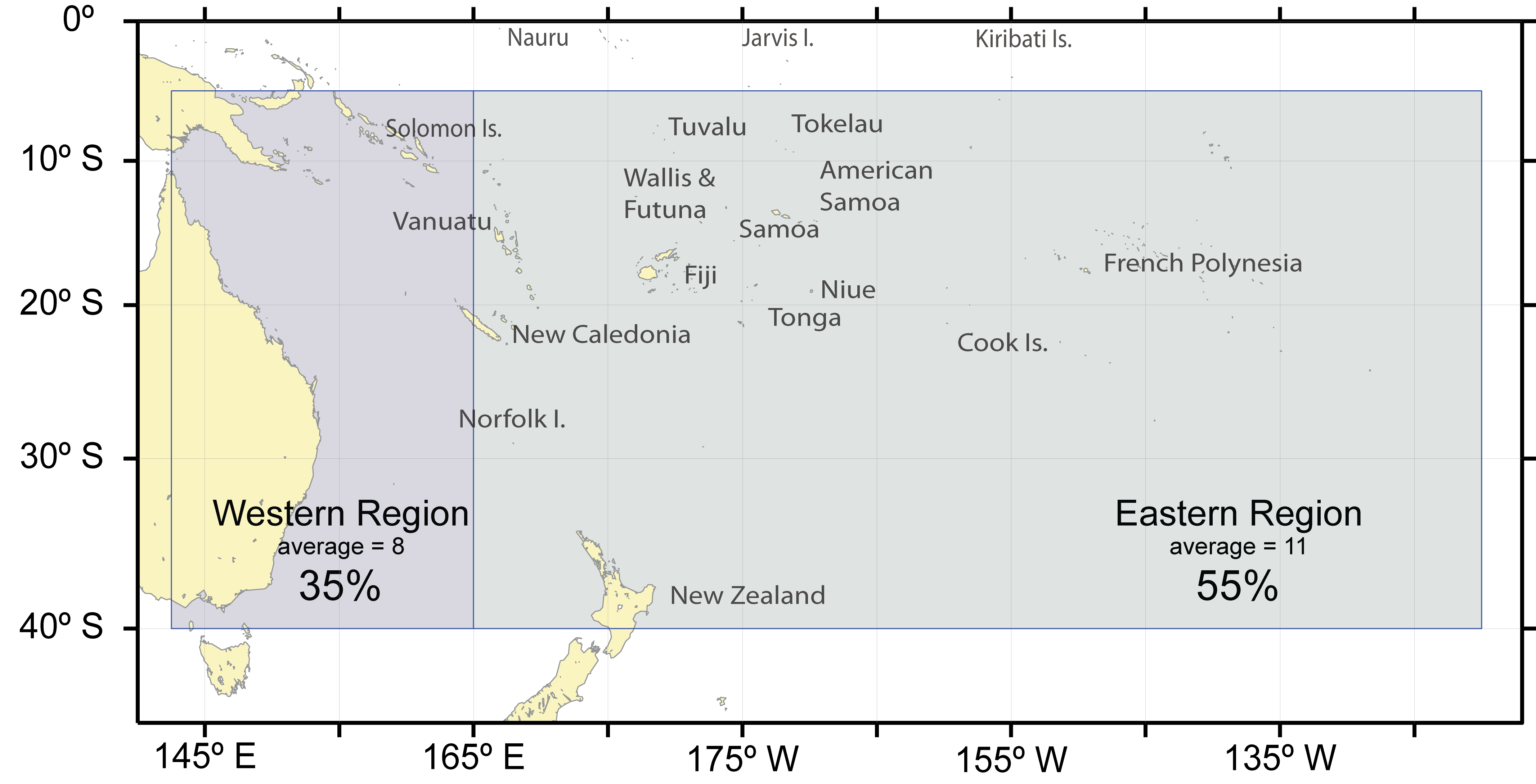 Whole South Pacific region | Near average | 53% | 15 | Low |