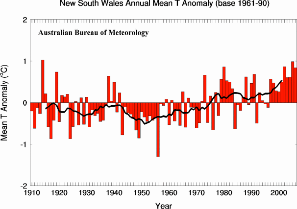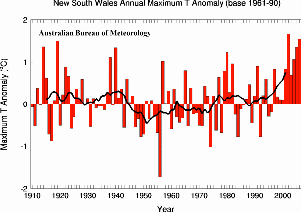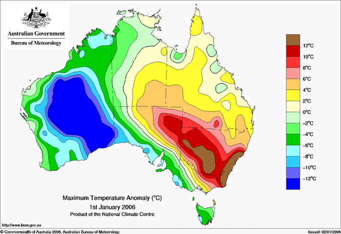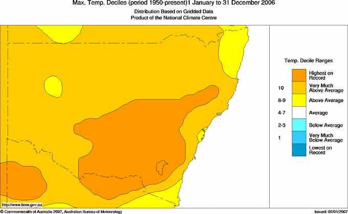 With a statewide average maximum temperature 1.6 degrees above the historical average of 23.9ºC, 2006 was the second hottest for day-time temperatures the state has recorded. The Murray Darling Basin (MDB) also recorded its second warmest year on record with maximum temperatures 1.6ºC above the historical average of 24.5ºC (See Map 2). The El Niño year of 2002 was the only year with warmer maximum temperatures since records began in 1910. The year began with extreme heat across the state on January 1 with Sydney Observatory Hill recording its second hottest day on record (44.2°C) and Sydney Airport 45.2°C (highest on record). (See Map 3). The years 2006, 2005, and 2002 all rank in the top 5 hottest the state has recorded since 1910. Significantly, this is a record tenth consecutive year of above average maximum temperatures for the state. (See Figure 2) This continues the pattern of rising temperatures consistent with global warming but was also exacerbated this year by the occurrence of El Niño. Reduced cloudiness and dry soils resulted in above average maximum temperatures.