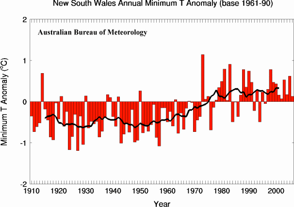 The overall statewide average minimum in 2006 was 0.1ºC above the historical average of 10.8ºC, with minimum temperatures above average in the north of the state. However, the far south of the state and an area extending from the Sydney Metropolitan to the Central Tablelands recorded lower than average minimum temperatures, with some areas near the Victorian border and around Sydney experiencing very much below average minimum temperatures (See Map 4). The cold nights were a result of the drought which reduced soil and atmospheric moisture to a minimum, enabling the dry land surface to cool quickly at night under clear skies. As with the maximum temperatures, 2006 is a record tenth consecutive year of above average statewide minimum temperatures. (See Figure 3).
