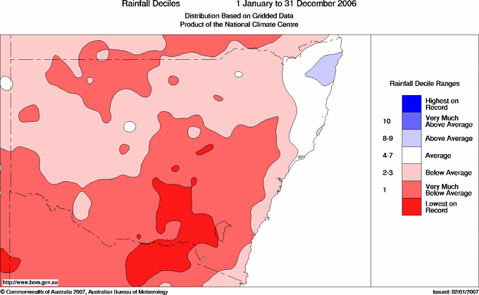 In 2006, NSW recorded its ninth driest year since statewide average records began in 1900. The statewide average rainfall for the year was just 349 mm compared to the historical average1 of 566 mm. Significant widespread rain in late December lifted the statewide annual rainfall average from what was to be the fifth driest year on record. Almost the entire state recorded below average rainfall for the year. With enhanced southeasterly winds onto the northern coast for much of the year the northeast of the state was spared from the El Niño induced drought and a small area of the central Northern Rivers recorded above average rainfall for the year. In stark contrast, the failure of cold fronts to deliver significant rainfall from autumn through spring resulted in large tracts of the southern and central slopes of the Great Divide recording lowest annual rainfall totals on record. Much of these areas, as well as parts of the Illawarra and South Coast, received between 400 and 800 mm below their average annual rainfall. Many centres recorded their lowest annual rainfall on record including Condobolin, Dubbo, Forbes, Griffith and Cabramurra (see Map 1). The drought commenced with below average rainfall in February and continued through the remainder of the year with the most severe rainfall deficiencies occurring in winter and spring with the onset of El Niño.