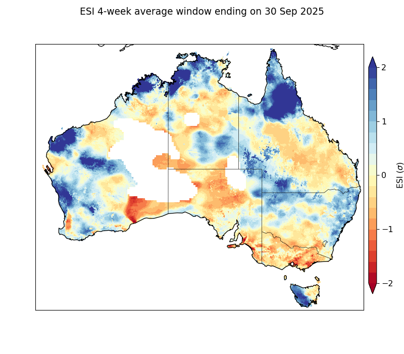 Evaporative stress for the 4 weeks ending 30 September 2025 was elevated (negative Evaporative Stress Index (ESI)) in: