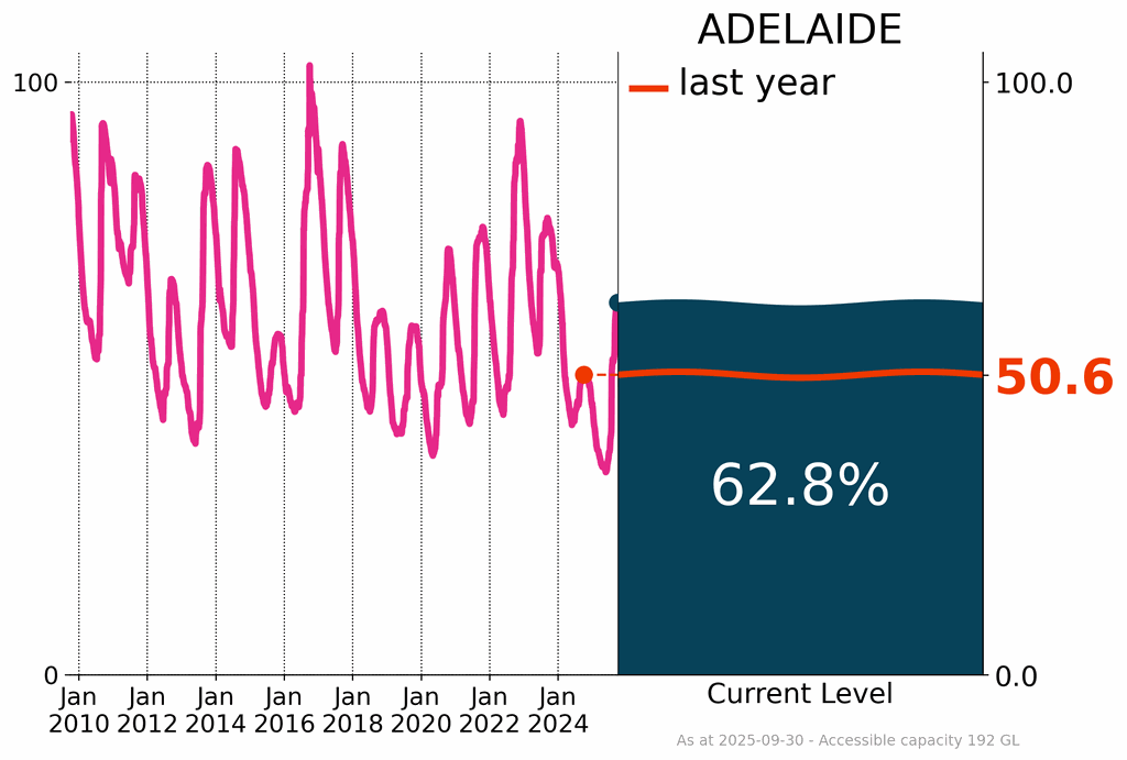 Adelaide’s storages were 62.8% full at the end of September, an increase of 5.6% from the previous month, and 12.2% higher than at the same time last year. The two largest storages supplying Adelaide remained close to 50%, with Kangaroo Creek and South Para reservoirs sitting at 53.5% and 50.7%, respectively. Adelaide’s urban water supply is augmented by transfers from the River Murray, with additional support from desalination and groundwater. River Murray pipelines also supply water to the Eyre and Yorke Peninsulas and parts of south-east South Australia.