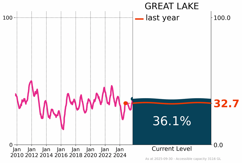 In Tasmania, the two largest storages—Lake Gordon and Great Lake—were at 53.7% and 36.1%, respectively, by the end of September. Total storage across Tasmania was 65.5%, an increase of 8.4% from August, but 0.5% lower than this time last year.