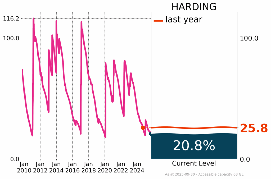 Harding Reservoir, the only major storage in the Pilbara–Gascoyne drainage division, was at 20.8% of capacity at the end of September, a decrease of 1.2% from the previous month, and 5.0% lower than at the same time last year.