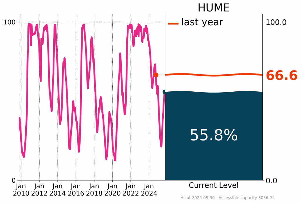 Many storages across the Murray–Darling Basin and South East Coast (Victoria) drainage division were below or close to 50% of capacity by the end of September, including Hume Dam, Australia’s seventh-largest reservoir, and Lake Eucumbene. Hume Dam increased by 3.9% during September, finishing at 55.8%.