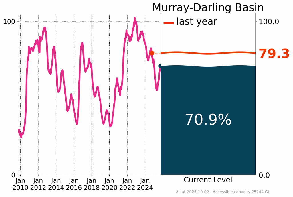 The overall storage volume across the Murray–Darling Basin increased by 2.4% during September, finishing the month at 70.9%. The increase was largely driven by inflows to larger storages, while many smaller reservoirs and weirs experienced declines. It is typical for Murray–Darling Basin storage to increase this time of year, due to lower demand and increased inflows in the south. Despite the monthly increase, total storage in the Murray–Darling Basin remained 8.4% lower than at the same time last year.