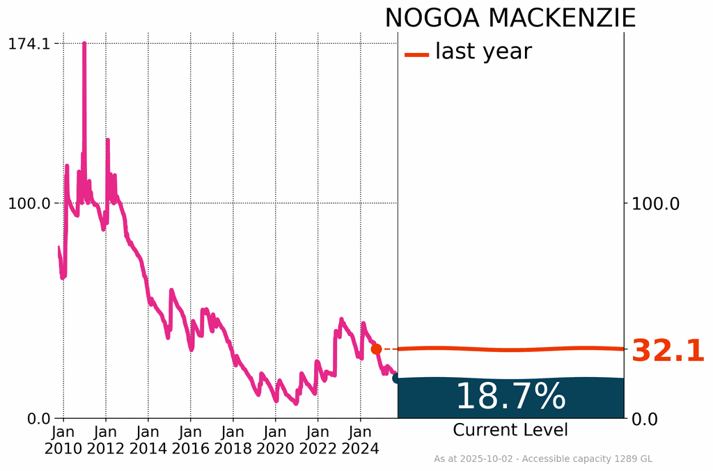 Fairbairn decreased by 1.6%, finishing the month at 18.7%. The decline at Fairbairn contributed to reduced overall volumes in the Nogoa-Mackenzie system (18.7% full) in September, which supplies water to rural communities across central Queensland. Lake Awoonga also decreased by 1.2%, ending September at 31.3%.