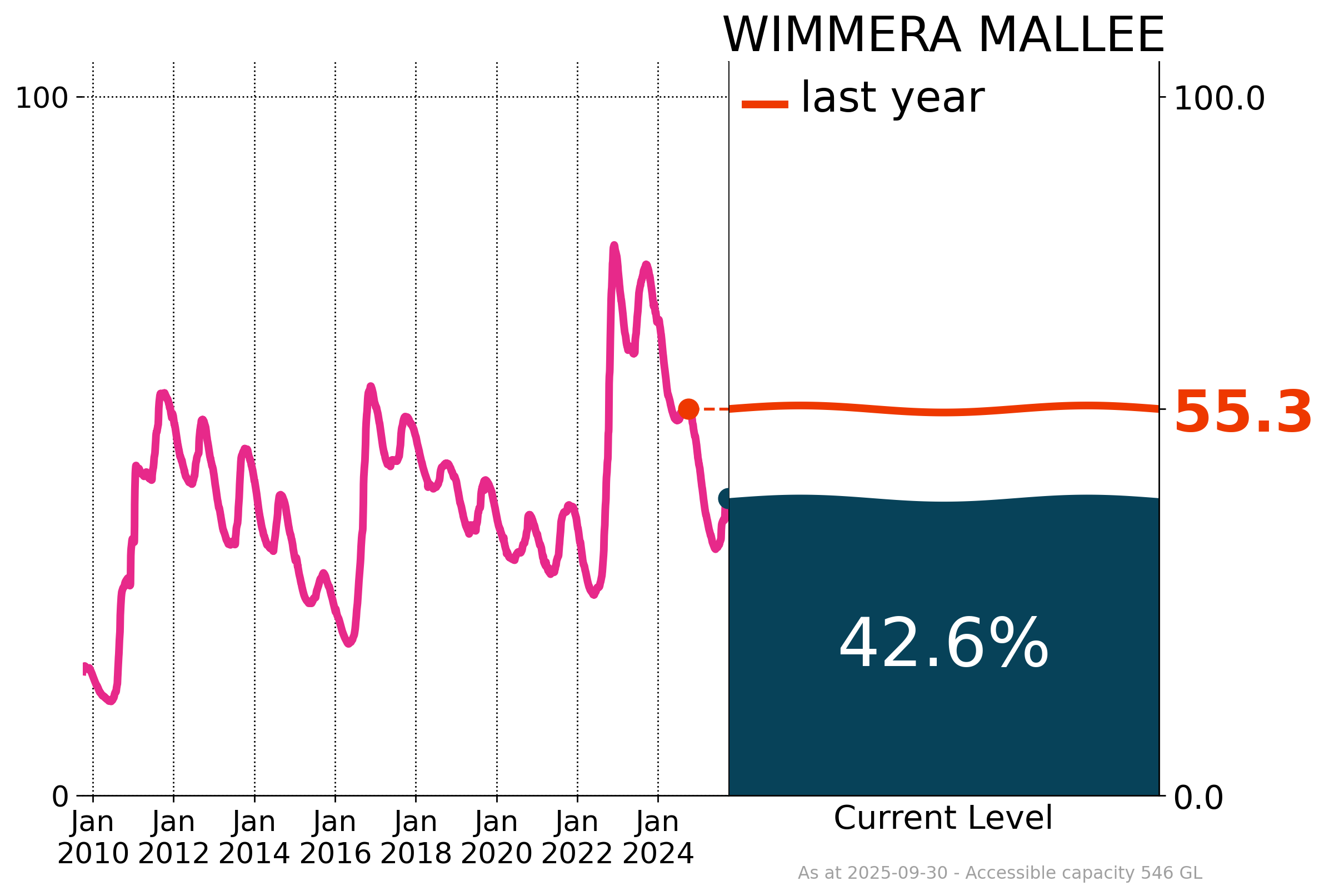 Overall storage volume across the South East Coast (Victoria) drainage division increased by 4.4% in September, ending the month at 42.9%. In the Wimmera–Mallee system, a critical rural water supply for domestic and agricultural use in western Victoria, storages increased by 1.5%, reaching 42.6% by the end of September. However, this was 12.7% lower than at the same time last year.