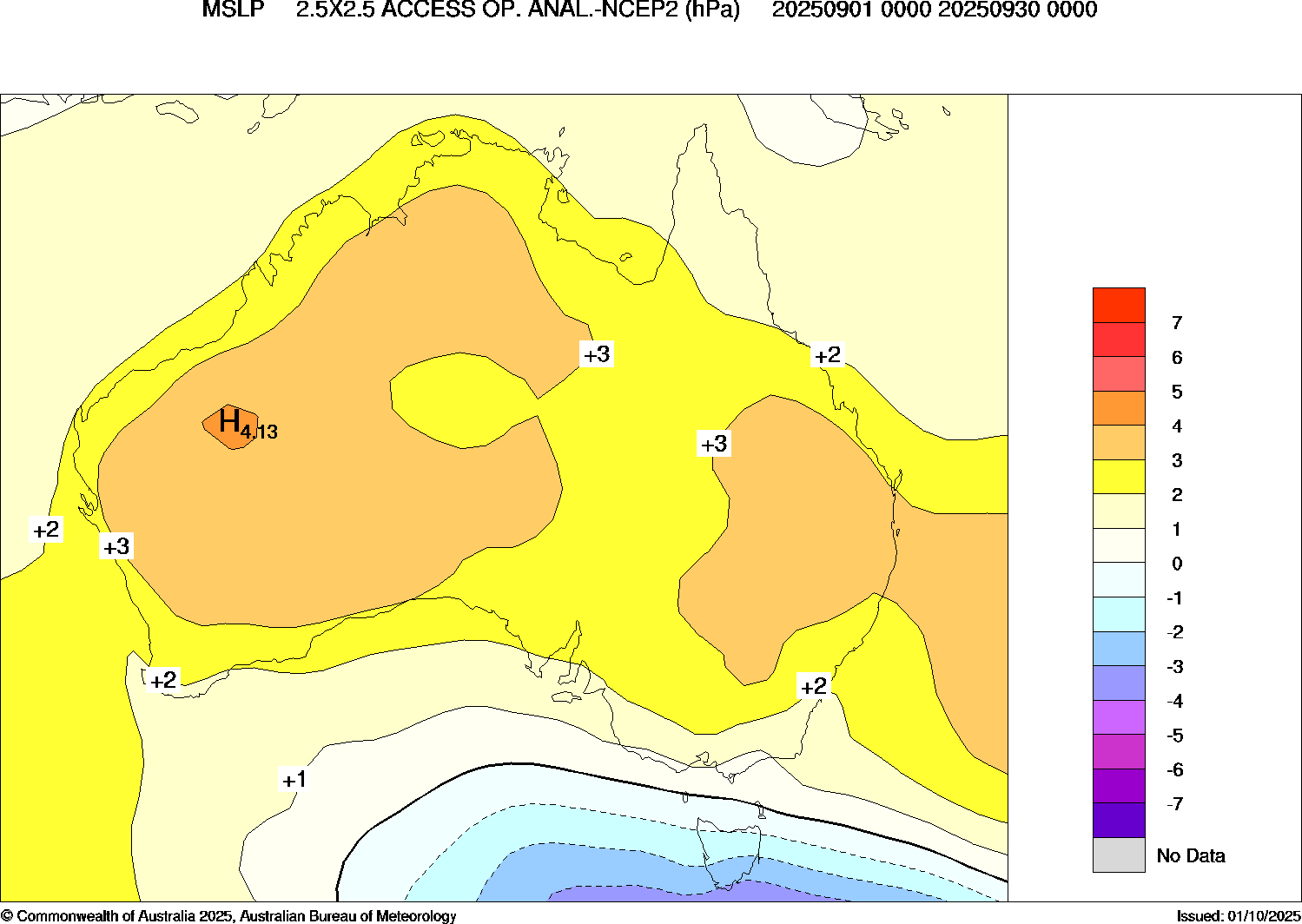 Throughout much of 2024 until June 2025, weather patterns across southern Australia were dominated by slow-moving high pressure systems contributing to persistent warm and dry conditions. During winter 2025 more typical cool season patterns of low pressure systems and fronts returned across southern Australia, however during September pressure was above average across Australia, except for Tasmania.