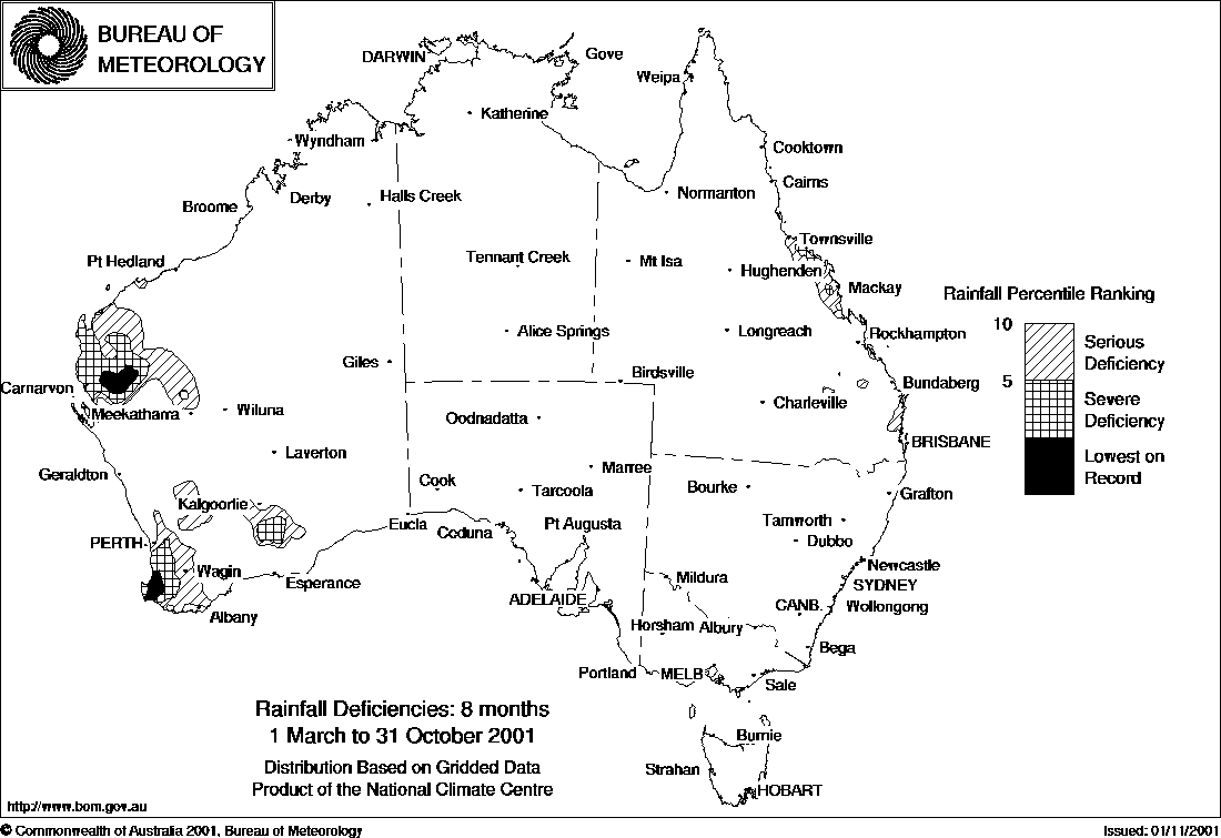 MEDIA RELEASE - ISSUED 5th NOVEMBER 2001 Deficiencies ease in Victoria, persist in W.A. and QueenslandThe Bureau of Meteorology announced today that above average October rains helped ease rainfall deficiencies in southern Victoria. However, there was little change to the patterns of deficiencies affecting southeast Queensland and the west of Western Australia. Large regions in southern and western W.A. have serious to severe deficiencies for the eight-month period from March to October. There was some slight easing in areas north of about Geraldton following above average falls in October, but average to below average October rainfall further south meant the pattern was generally unchanged through this region. Totals were the lowest on record for this particular period near the far southwest corner of the State, and to the east of Carnarvon. Most of western and southern W.A. also experienced rainfall deficiencies during the 2000 southern growing season. There was little change in the pattern of Queensland rainfall deficits which reflect continued below average falls following poor summer rains. For the eleven months from December 2000 to October, serious to severe rainfall deficiencies affect most coastal areas from St. Lawrence to Brisbane, as well as a broad sweep of country centred on a line from Roma to Gladstone. Southeast Queensland also experienced well below average rainfall last year. Rainfall deficiencies have waxed and waned across southern