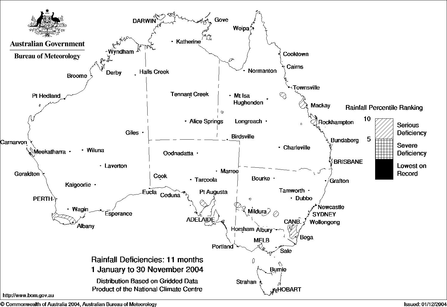 periods ending 30th November 2004 Rainfall deficiencies removed in northeast NSW and southeast QueenslandThe Bureau of Meteorology announced today that above to very much above average November rains in far northeast NSW and southeast Queensland, removed rainfall deficiencies for the period since the start of April. There was also a decrease in deficiencies over inland southern NSW for the period since January, although some patches remain. Rainfall deficiencies also persist in parts of central Queensland and southern WA. For the 8-month period from April to November, serious, and in a few cases severe, rainfall deficiencies have contracted to Queensland’s central coast between Bowen and Gladstone and in some areas further inland over the Central Highlands and Coalfields district. A small patch also remains near Grafton in northeast NSW and several areas between Albany and Esperance in southern WA are also affected. No further statements will be issued for the period beginning in April 2004 as southern WA is entering its dry season, and central Queensland rainfall will be monitored as part of the northern wet season. For the 11-month period from January to November, serious rainfall deficiencies affect several patches in southern NSW, the largest of which also covers the ACT. Average to above average rainfall in November reduced both the intensity and extent of rainfall deficiencies in southern NSW, and removed the few remaining patches in northern Victoria. Serious deficiencies are also analysed near Mackay and Rockhampton on Queensland’s central coast, and in the far southwest of WA. Much of southern and eastern Australia continues to experience deficiencies for periods longer than two years and only a prolonged period of above average rainfall will remove them. Rainfall deficiency