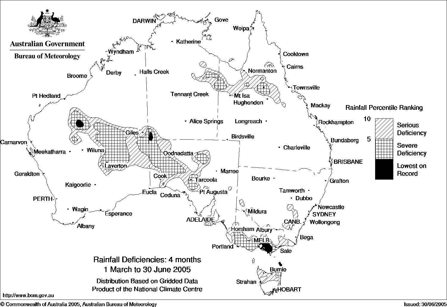 and 12-month periods ending 30th June 2005 June drenching brings welcome reliefThe Bureau of Meteorology announced today that heavy, and in some cases record June rainfall over eastern and southern coastal Australia, has largely removed serious to severe rainfall deficiencies that had developed during 2005. Most of the northern two-thirds of New South Wales and the southern half of Queensland recorded more than twice the long-term June average, with large areas having had more than four times the monthly average. It must be remembered though, that the climate is naturally rather dry in June over western NSW and Queensland, with monthly means below 25 mm in many instances. However, despite the recent heavy rains, rainfall deficits extending back over three years and longer (affecting water storages and stream flows in particular) still remain across large parts of eastern Australia. Some areas missed out on significant June rainfall, most notably southern Victoria, northern Tasmania and parts of northwestern and central Australia. For the 4-month period from March to June, notable rainfall deficiencies have contracted to southern Victoria, the far southeast of South Australia, northern Tasmania and isolated patches in New South Wales. An area extending from Melbourne to southwest Gippsland has recorded its driest March to June period on record, and this comes on top of record low 8-year rainfall totals in this same region. The coverage of rainfall deficiencies for the 6-month and 12-month periods beginning in January 2005 and July 2004 respectively, are very similar with large areas affected from northwest WA to the east and south of the NT, as well as the far northwest of SA. Lowest on record totals are common. The heavy June rainfall removed or eased deficiencies in the far northeast of SA and the adjacent parts of western NSW, western Queensland and the southeast of the NT. Northern Tasmania is also affected over both time-spans, with an area to the east of Launceston having had its driest 12-month July to June period on record. Rainfall deficiency maps for longer periods can be found at http://www.bom.gov.au/cgi-bin/silo/rain_maps.cgi. Rainfall deficiency