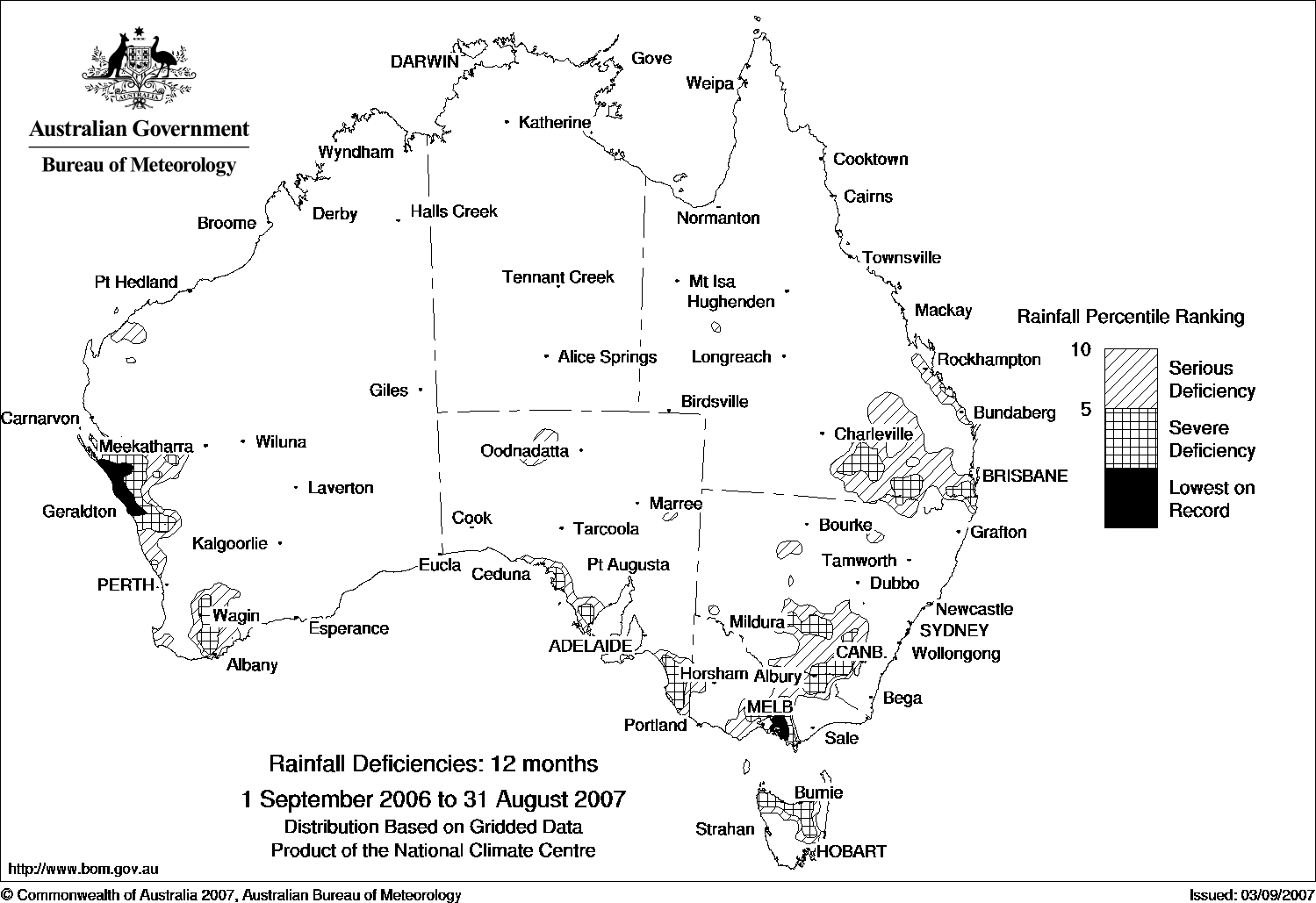 Rainfall deficiencies for the 4-month period from May to August 2007 were