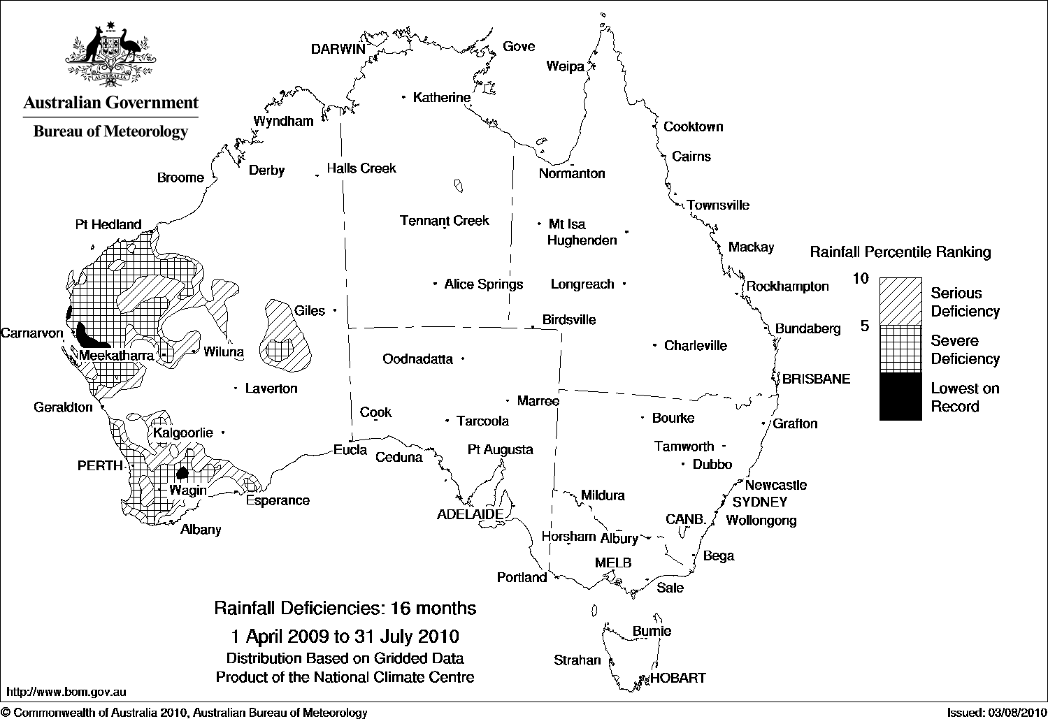 For the 16-month period from April 2009 to July 2010, below average falls over the western half of WA during July 2010 further exacerbated areas of rainfall deficiency as described in the previous drought statement, with areas of severe deficiency becoming much more extensive in the southwest part of the state. An area of lowest on record has developed in the eastern Great Southern district. Serious to severe rainfall deficiencies remain evident over much of the Pilbara and Gascoyne districts and areas of lowest on record rainfall have developed in the Carnarvon region.