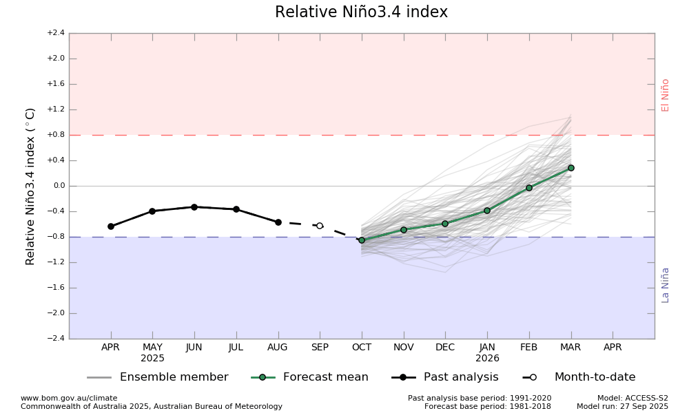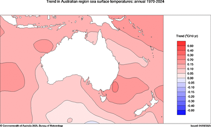Australian climate is influenced by sea surface temperature and atmospheric patterns in the Pacific, Indian and Southern ocean regions. Specific regions are monitored, as they can indicate the presence, or potential development, of ENSO (El Niño/La Niña), Indian Ocean Dipole (IOD) phases and Southern Annular Modes. Sea surface temperature (SST) anomalies are also used to monitor marine heatwaves, which can have significant impacts on marine ecosystems and coastal communities.
