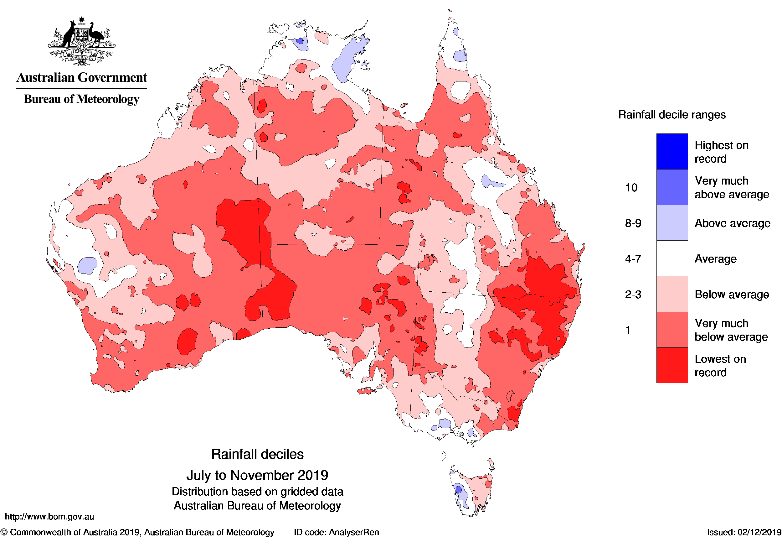 Overall, 2019 to-date has been a very dry year for Australia. January–November rainfall has been the second-lowest on record for Australia as a whole (spanning 120 years), coming in behind only January–November 1902. For the year to date, rainfall has been below to very much below average over most of Australia except central to northern Queensland.